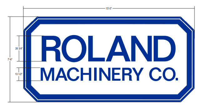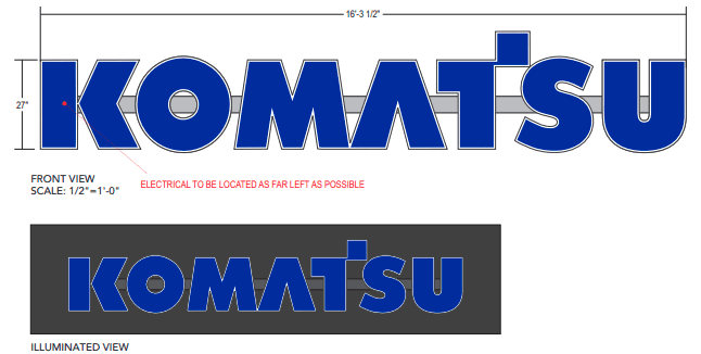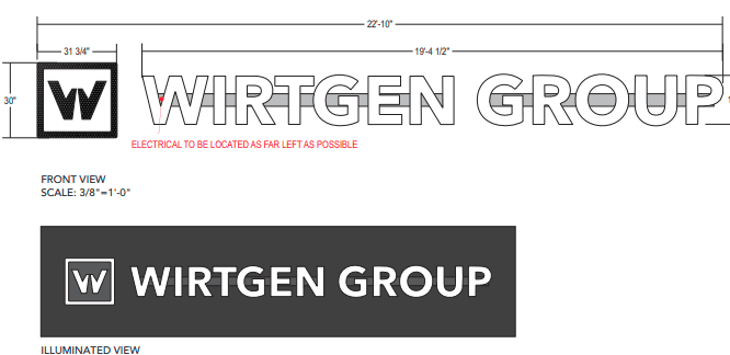 The upcoming enhancements will feature an internally illuminated wall sign for Roland Machinery Co., utilizing white LED lights seamlessly mounted to the building. Additionally, there will be a ‘Komatsu’ sign comprised of fabricated aluminum channel letters with a blue trim cap. Furthermore, a ‘Wirtgen Group’ sign will be created using fabricated aluminum channel letters and a logo placed within a fabricated aluminum cabinet, featuring a black trim cap and a white acrylic face.